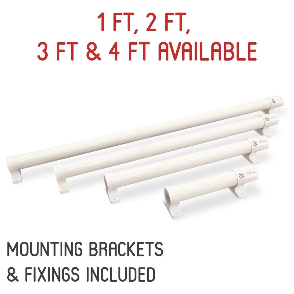 - 4 SIZES – 1ft (60W) 2ft (120W) 3ft (180W) 4ft (240W) all with a 130°c thermal protector. Made from White Plastic and Metal.
