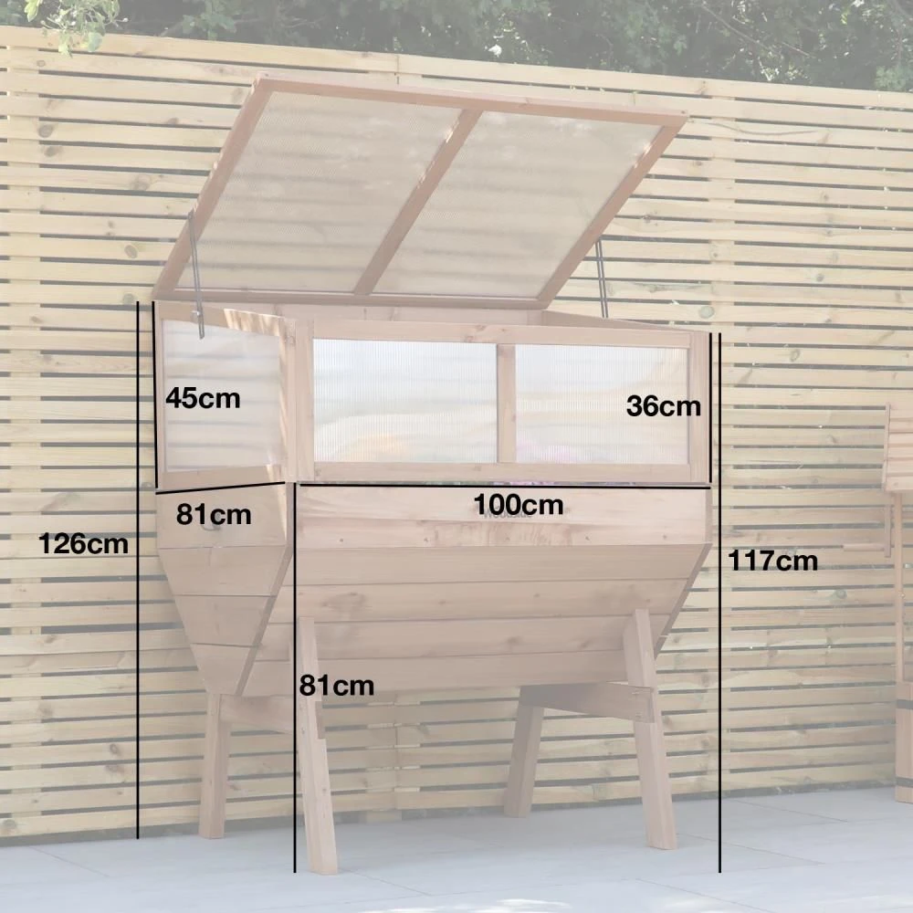 - SPECIFICATIONS – Cold frame: L 100cm x D 81cm x H 45/36cm. Planter: L 100cm x W 81cn x H 81cm. Planter depth: 43cm. Material: Fir wood. Full instructions and fixings are included for a quick and easy assembly