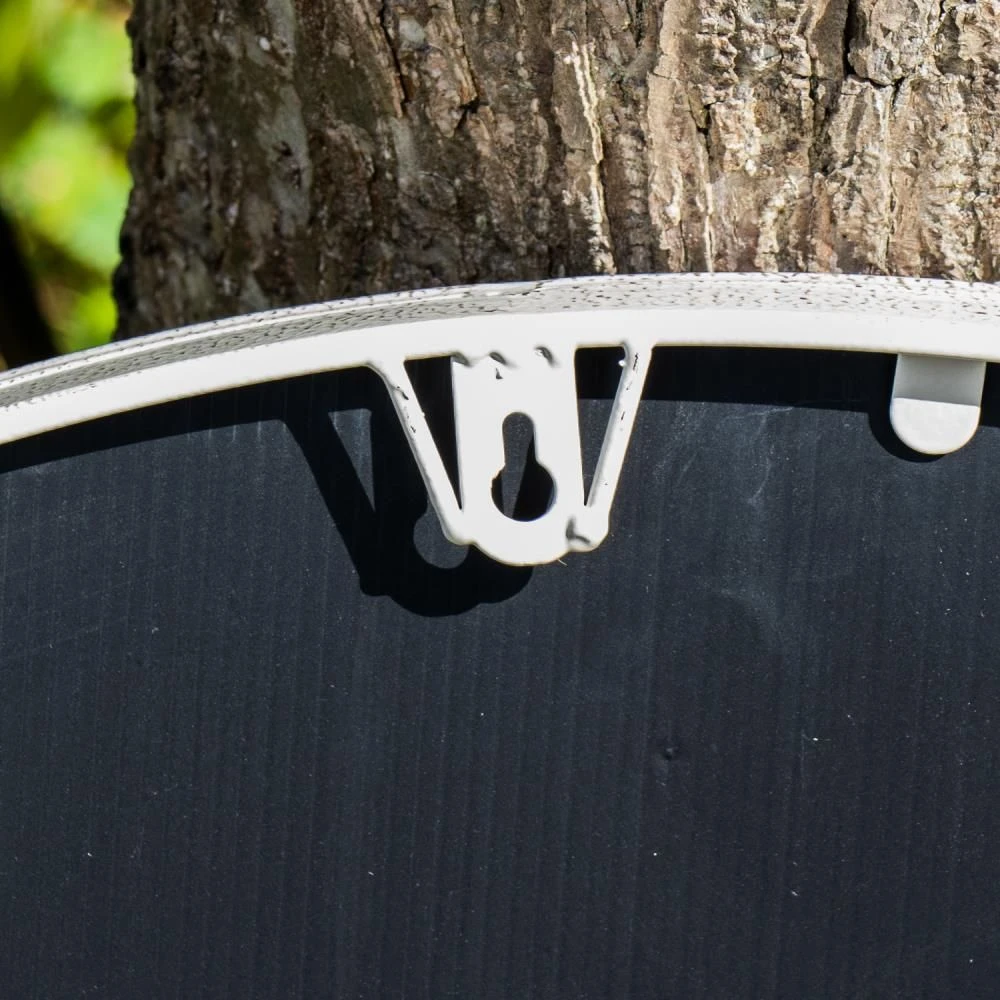 - STYLISH – The Upton Large white metal round garden mirror has a lovely traditional design that will create a stand out attraction in your garden. You can also use the mirror indoors. PLEASE NOTE: The white frame has a rustic/worn finish